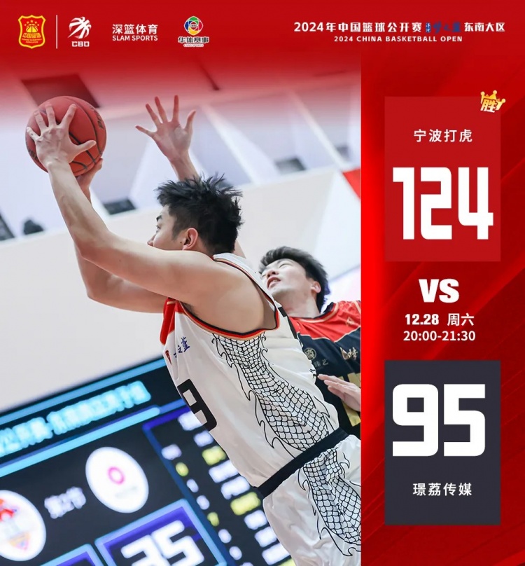 比賽開始,寧波打虎98號王宇接4號江楠助攻,兩分命中,幫助球隊(duì)拿下第一分。璟荔傳媒0號脫凡防守端搶斷立功,17號林輝輝進(jìn)攻得手。雙方比分交替上升,但較大的防守強(qiáng)度給隊(duì)員的體能帶來不小壓力,上半場后程璟荔傳媒進(jìn)攻端失誤增加,寧波打虎抓準(zhǔn)機(jī)會拉開分差,攜帶16分優(yōu)勢進(jìn)入下半場。下半場開始璟荔傳媒奮起反擊,17號林輝輝、22號衛(wèi)炬吉拼搶相當(dāng)積極,隊(duì)內(nèi)5人得分上雙,但無奈寧波打虎全隊(duì)實(shí)力超群,得分點(diǎn)較多,實(shí)力堅(jiān)挺,本場9人得分上雙,最終順利以124-95戰(zhàn)勝璟荔傳媒,打進(jìn)冠亞軍決賽。