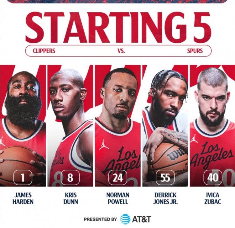 賽前,快船公布首發(fā)陣容:哈登、鄧恩、鮑威爾、小瓊斯、祖巴茨。