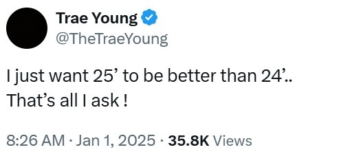 1月1日訊 今天,老鷹球星特雷-楊更推道:“我就希望2025年比2024年更好,這就是我的全部要求?!?/p>