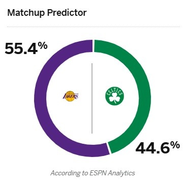 ESPN給出了本場比賽雙方勝率,其中湖人為55.4%,凱爾特人為44.6%。