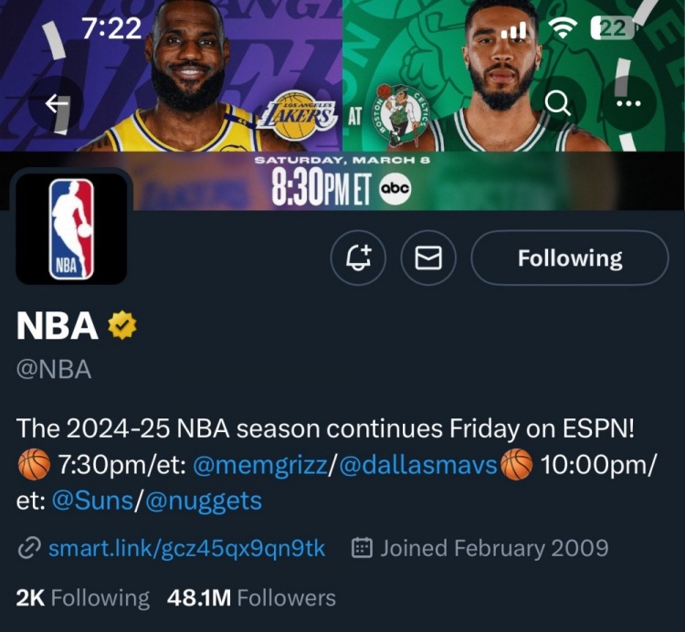 值得一提的是,該博主截圖時(shí)今日由ESPN全美直播的兩場(chǎng)比賽還未舉行,而NBA官推只是在賬號(hào)介紹語(yǔ)中宣傳了這兩場(chǎng)比賽(灰熊vs獨(dú)行俠,太陽(yáng)vs掘金)。