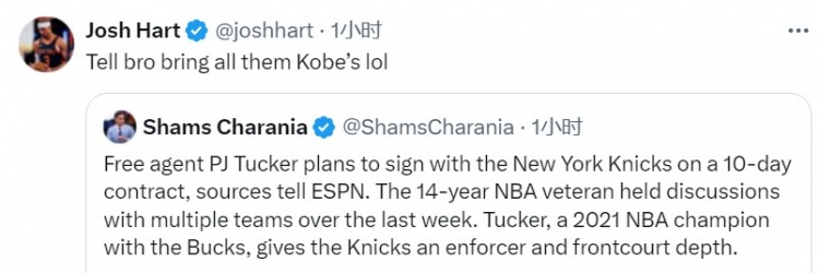 尼克斯球員哈特調(diào)侃道:“告訴兄弟,把他的所有科比鞋都帶來?!?/p>