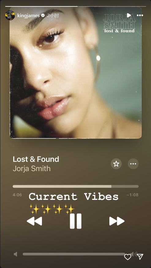 賽后,詹姆斯在個(gè)人社媒分享了歌手Jorja Smith的單曲《Lost & Found》并配文:“現(xiàn)在的感受???”