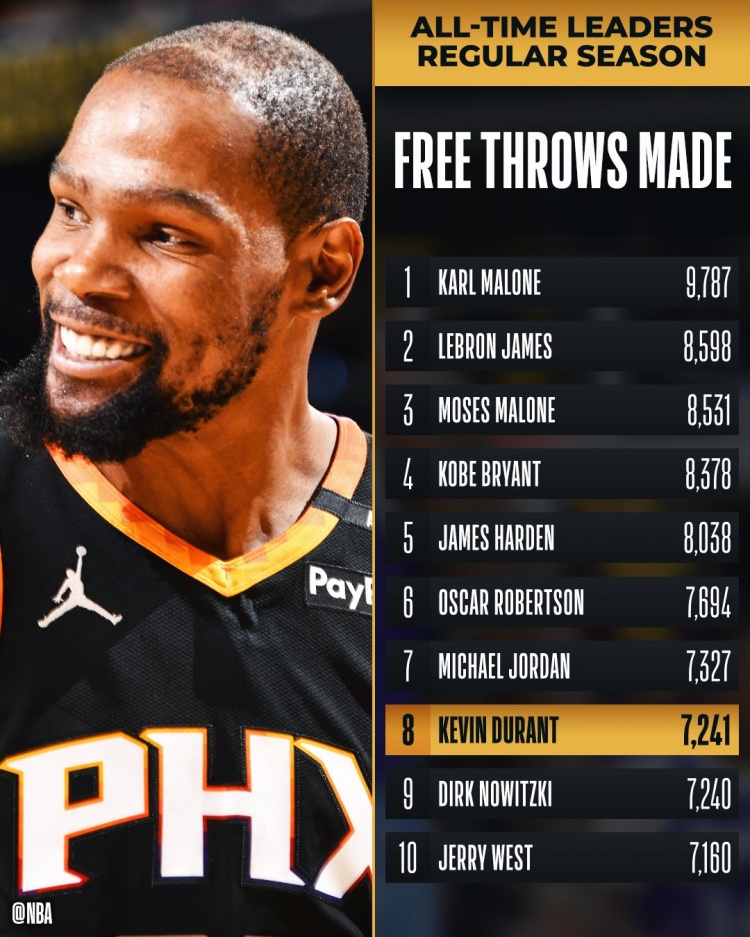這樣一來,杜蘭特生涯常規(guī)賽罰球命中數(shù)達到7241次,超越諾維茨基(7240)升至NBA歷史第8位,下一步將追逐喬丹。