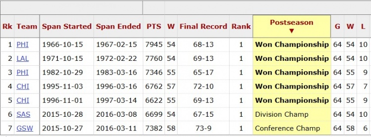 而此前七次有這種表現(xiàn)的球隊中,有五支球隊在當(dāng)賽季成功奪冠,沒有奪冠的兩支球隊是15-16賽季的勇士和15-16賽季的馬刺。