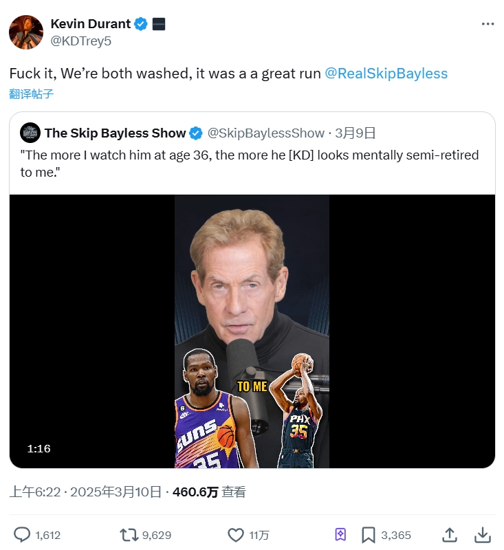 杜蘭特“鍵來(lái)”,轉(zhuǎn)發(fā)了這個(gè)視頻,并評(píng)論:“去TM的,我們都是垃圾,真是一段美好的時(shí)光@Skip。”