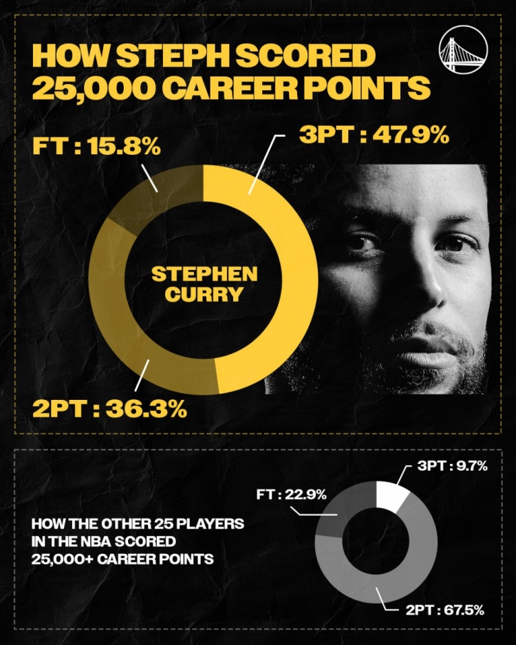 庫里25000分得分方式占比:兩分36.3%,三分47.9%,罰球15.8%;