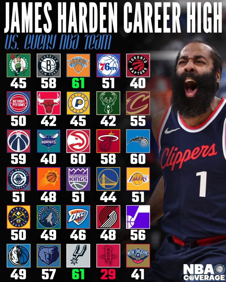 哈登對陣各隊最高得分:面對29隊砍40+ 打尼克斯馬刺轟61分