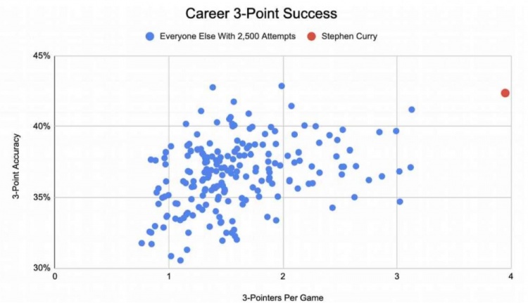 (圖為生涯至少出手2500記三分球的球員三分投射情況,橫軸為場均三分命中數(shù),縱軸為三分命中率,紅點為庫里)