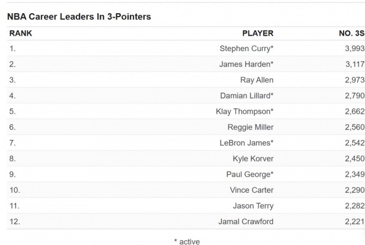 (圖為三分球命中總數(shù)歷史榜單)
