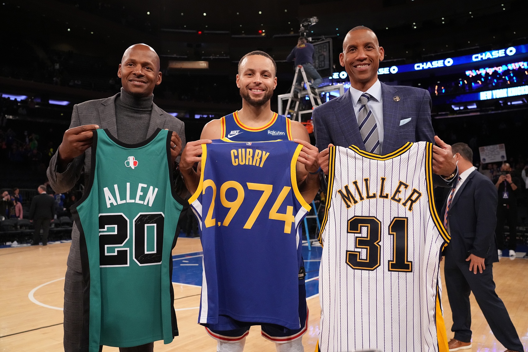 2005年,雷吉-米勒帶著生涯命中2560記三分球的紀錄退役,成為NBA的歷史三分王。6年后,雷-阿倫超越了他,并在2014年退役時將自己的三分球命中總數(shù)定格在2973記。然而,就在雷-阿倫將三分球歷史紀錄推向新高的同時,庫里正在悄然改變?nèi)藗儗ν痘@的認知,重新定義三分球的可能性。