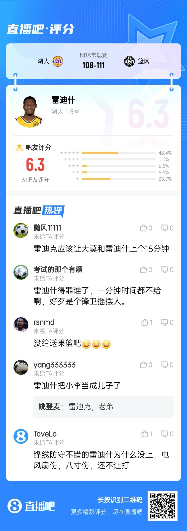 人都傷沒了雷迪什仍被DNP吧友打6.3高分:你沒送果籃?