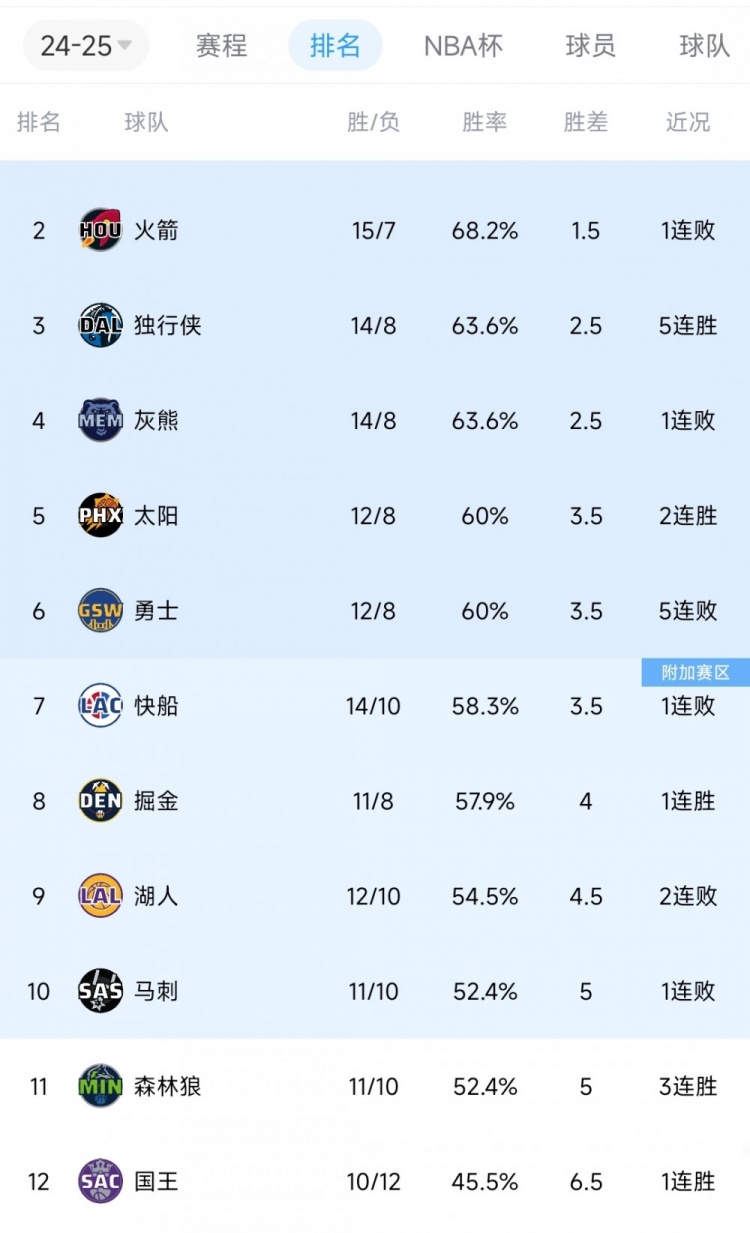 湖人目前12勝10負排在西部第9。