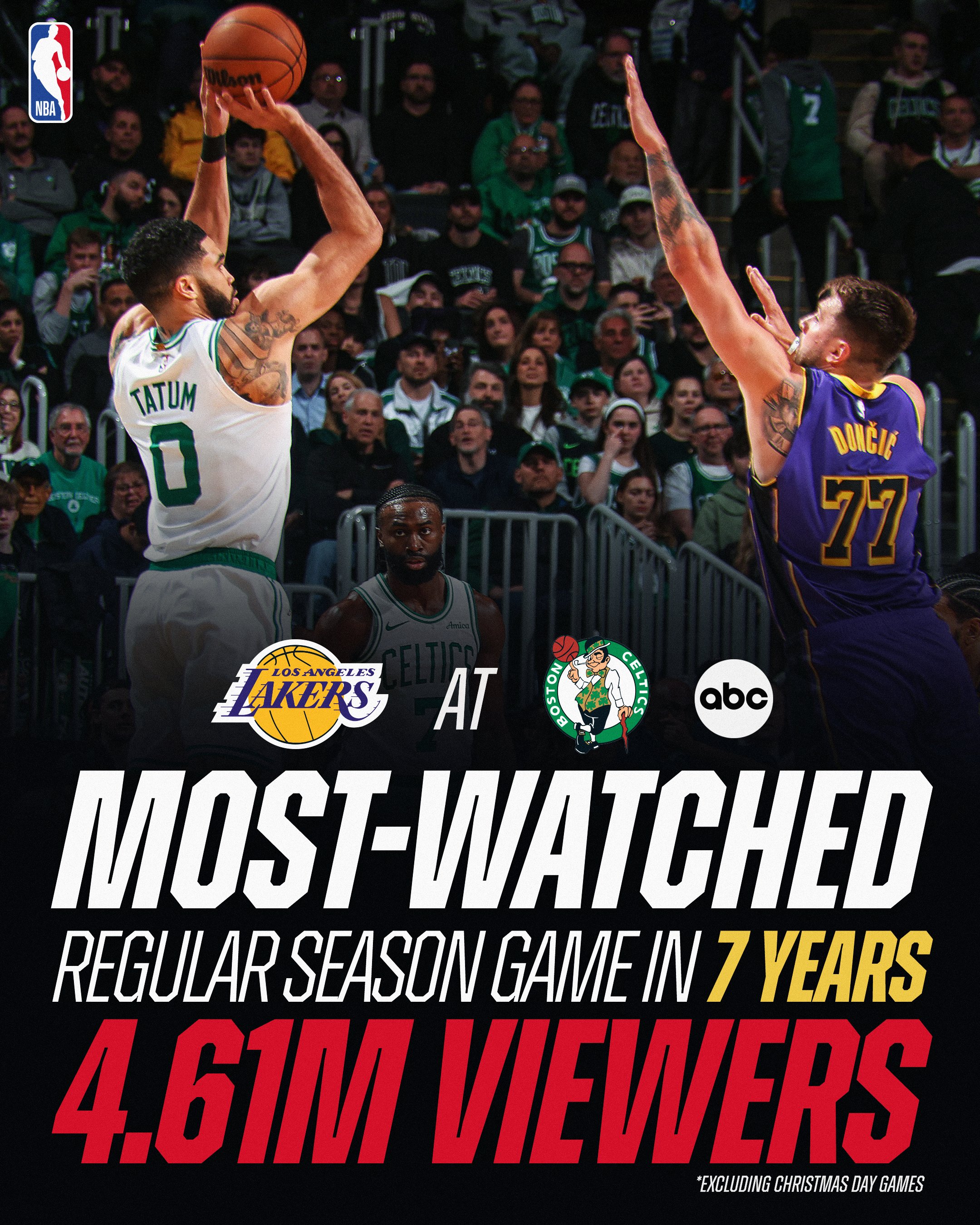 在NBA周六黃金時段的比賽中,湖人對陣凱爾特人的比賽平均吸引了461萬觀眾,在ABC電視臺播出。這使得該場比賽成為過去七年來(不包括圣誕節(jié))收視率最高的常規(guī)賽,并且比同期時段的收視率提高了92%。