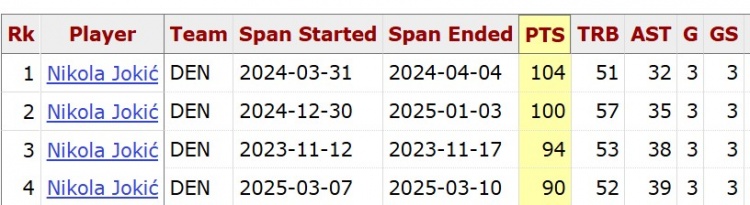 據(jù)統(tǒng)計,約基奇在連續(xù)3場比賽中至少得到90分50籃板30助攻,自聯(lián)盟合并以來唯一,而且他生涯已經(jīng)是第4次做到這一點。