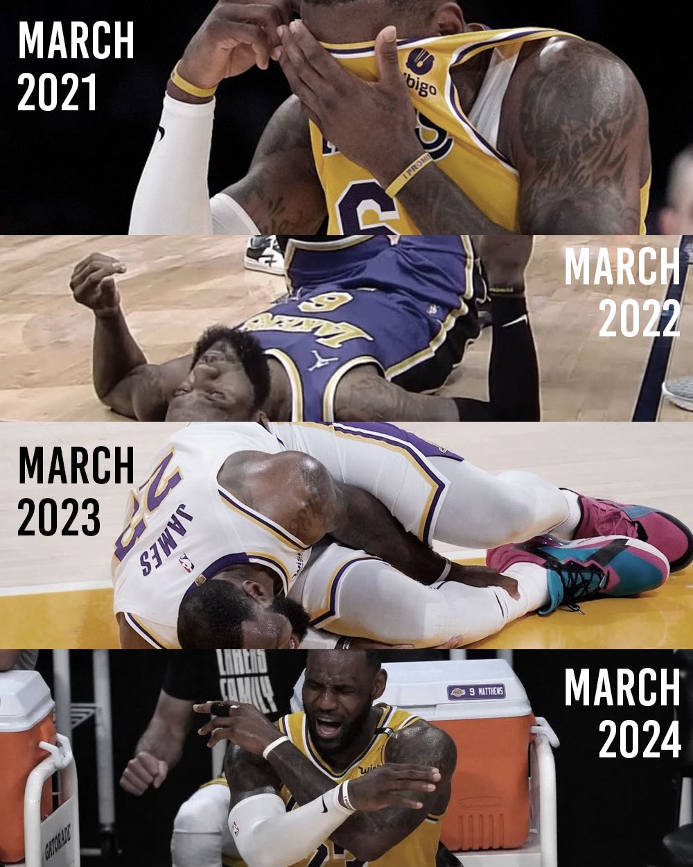 2022年3月份,詹姆斯因為膝蓋腫脹以及腳踝問題缺席了4場比賽
