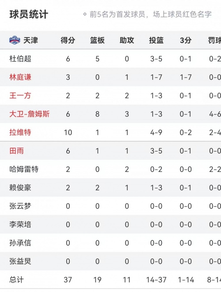 天津全隊(duì)上半場在三分線外的手感都不理想,全隊(duì)出手14次三分僅投中1球,其中林庭謙一人三分7投1中。
