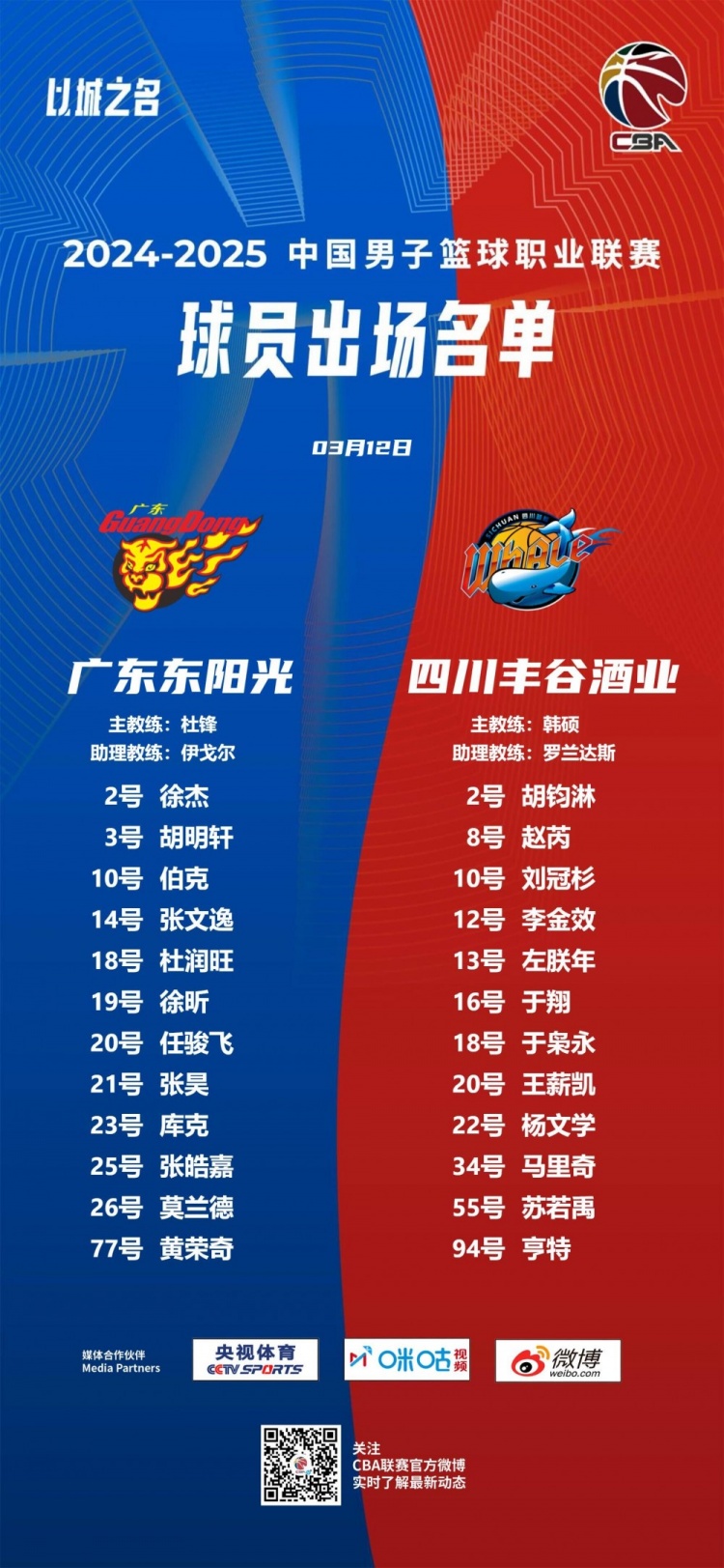 3月12日訊 CBA常規(guī)賽,廣東主場對陣四川,賽前雙方公布了本場比賽的大名單。