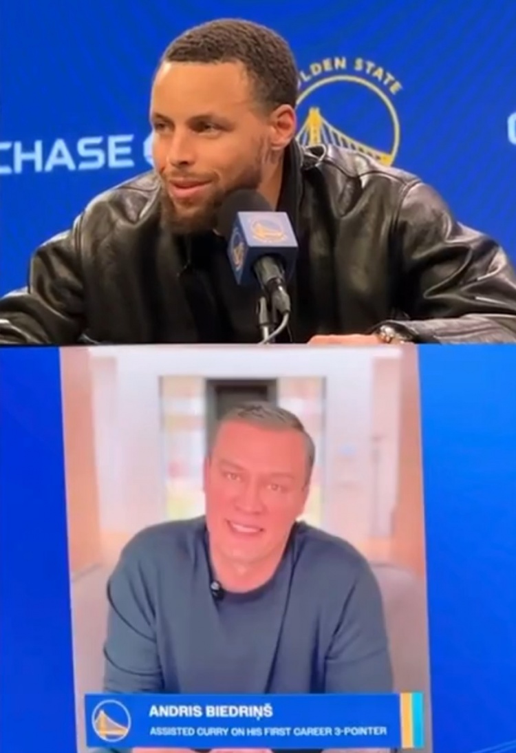 庫里命中4000記三分比賽暫停之后,大屏幕播放視頻紀(jì)念這一時(shí)刻,視頻中比德林斯助攻了庫里生涯的第一記三分,這也讓庫里感慨頗深。