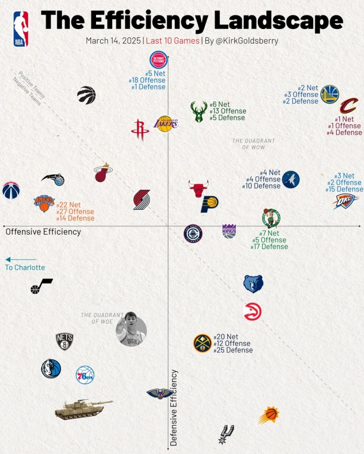 近10場攻防效率:騎士與活塞分別領(lǐng)銜攻防 勇士攻防均排名前三