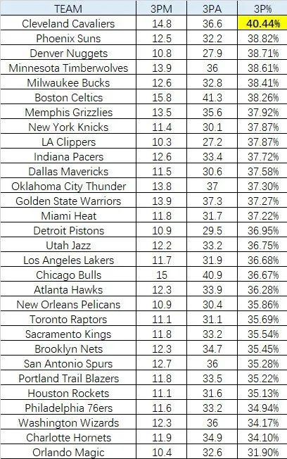 如今聯(lián)盟三分出手最多的是凱爾特人,這支球隊(duì)在限制區(qū)域的出手次數(shù)只排在聯(lián)盟第28;相比之下,騎士的三分出手?jǐn)?shù)和限制區(qū)域出手?jǐn)?shù)分別排在第4和第13。