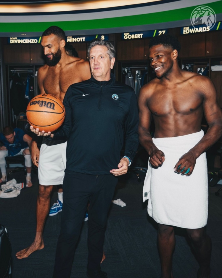 賽后全隊(duì)在更衣室為芬奇慶祝,后者也拿到了比賽用球。愛德華茲和戈貝爾更是僅僅裹著一條浴巾就和芬奇合影,老將英格爾斯也擁抱送上祝賀。