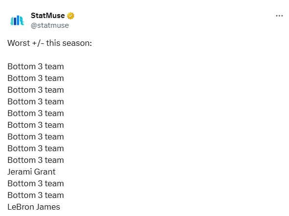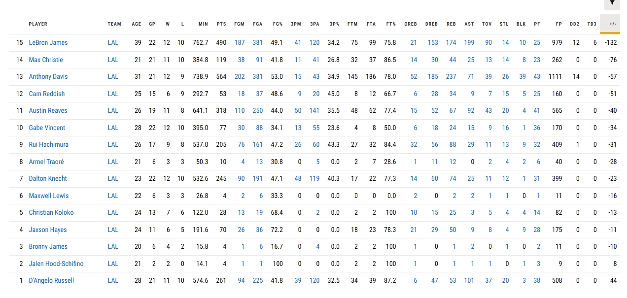 本賽季至今,詹姆斯的累計正負(fù)值為-132(在湖人隊內(nèi)墊底),在聯(lián)盟排名倒數(shù)第13位(正數(shù)第482位)。