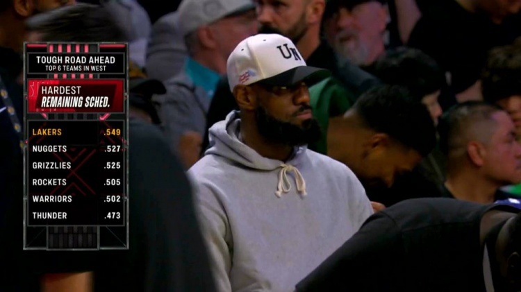 比賽進(jìn)行期間,轉(zhuǎn)播方列出了西部前6球隊剩余的賽程難度系數(shù)(數(shù)值越大賽程越難),湖人的難度最高: