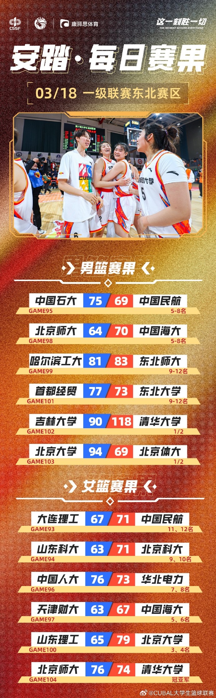 男籃方面,清華北大再次會(huì)師決賽。女籃方面,北京師大雙加時(shí)險(xiǎn)勝清華大學(xué),時(shí)隔三年再次拿回東北王的寶座!
