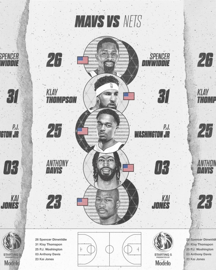 賽前獨(dú)行俠官方公布了本場(chǎng)比賽首發(fā):濃眉、克萊、丁威迪、凱-瓊斯、PJ-華盛頓。