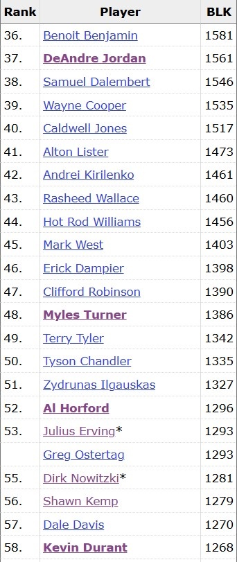 本場(chǎng)比賽過后,杜蘭特的常規(guī)賽生涯蓋帽總數(shù)來到1271次,超越戴爾-戴維斯,上升至NBA歷史第57位。