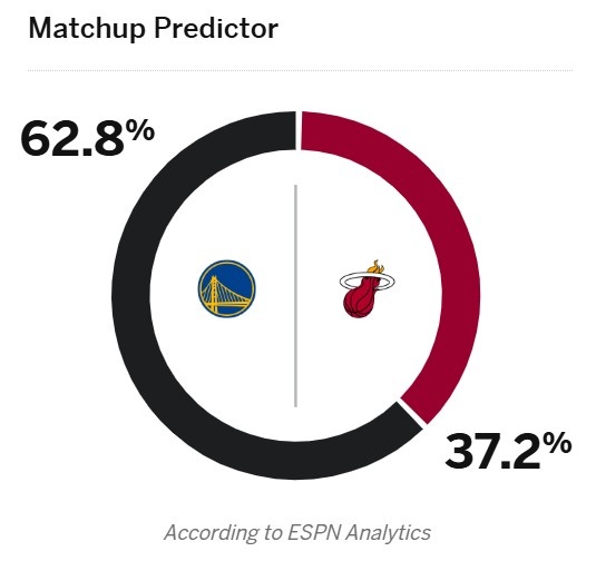 今天,ESPN預(yù)測本場比賽勝率,勇士為62.8%,熱火為37.2%。