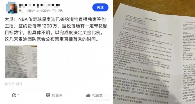 12月6日訊 今日,據(jù)《藍鯨新聞》報道,麥迪與淘寶直播合同期限為3年,每年簽約費1200萬。原文如下: