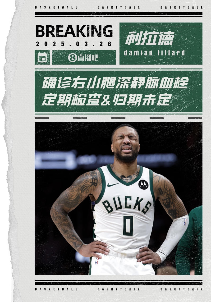 03月26日訊 名記Shams報(bào)道,雄鹿后衛(wèi)利拉德確診為右小腿深靜脈血栓(DVT)將無限期休戰(zhàn)。