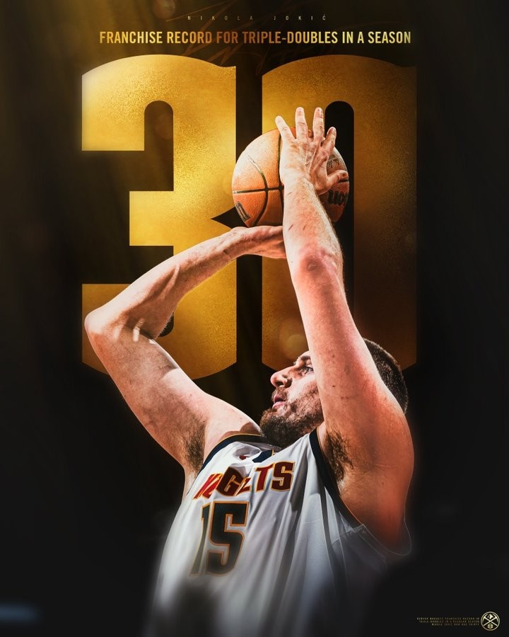 本場比賽約基奇復(fù)出砍下39分10籃板10助攻,達(dá)成賽季第30次三雙。