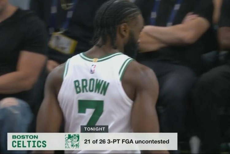 據(jù)統(tǒng)計,凱爾特人本場前26次三分出手有21次是沒有干擾的。半場結(jié)束是,綠軍的三分球32投14中。