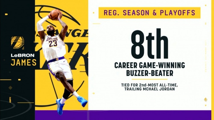 據(jù)統(tǒng)計(jì),這是詹姆斯生涯(常規(guī)賽+季后賽)第8次完成壓哨絕殺,他追平了科比-布萊恩特和喬-約翰遜,并列歷史第二,僅次于邁克爾-喬丹的9次壓哨絕殺。