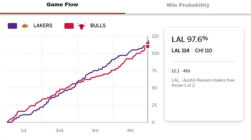 終場(chǎng)前12.1秒,里夫斯兩罰全進(jìn),湖人以115-110領(lǐng)先!當(dāng)時(shí)ESPN預(yù)測(cè)湖人本場(chǎng)的勝率高達(dá)97.6%,但公牛沒有認(rèn)輸。他們掀起了瘋狂反擊,打出9-2的攻擊波實(shí)現(xiàn)極限逆轉(zhuǎn),基迪最后還沒過半場(chǎng)就出手超遠(yuǎn)三分上演絕殺!