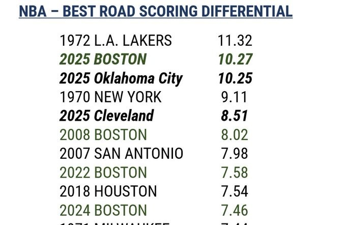 據統(tǒng)計,本場比賽過后,凱爾特人的賽季場均客場凈勝分來到10.27,超越本賽季的雷霆(10.25),升至歷史第二位,僅次于1972年的湖人。