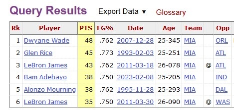 據(jù)統(tǒng)計(jì),希羅(25歲67天)成為熱火隊(duì)史單場砍下至少35分且投籃命中率75%+最年輕的球員。榜單其余球員如下: