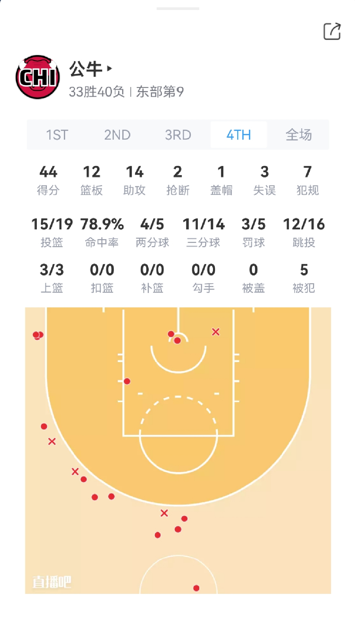 最后一節(jié),公牛的三分有如神助,單節(jié)三分球14投11中,而且左側(cè)三分居多。