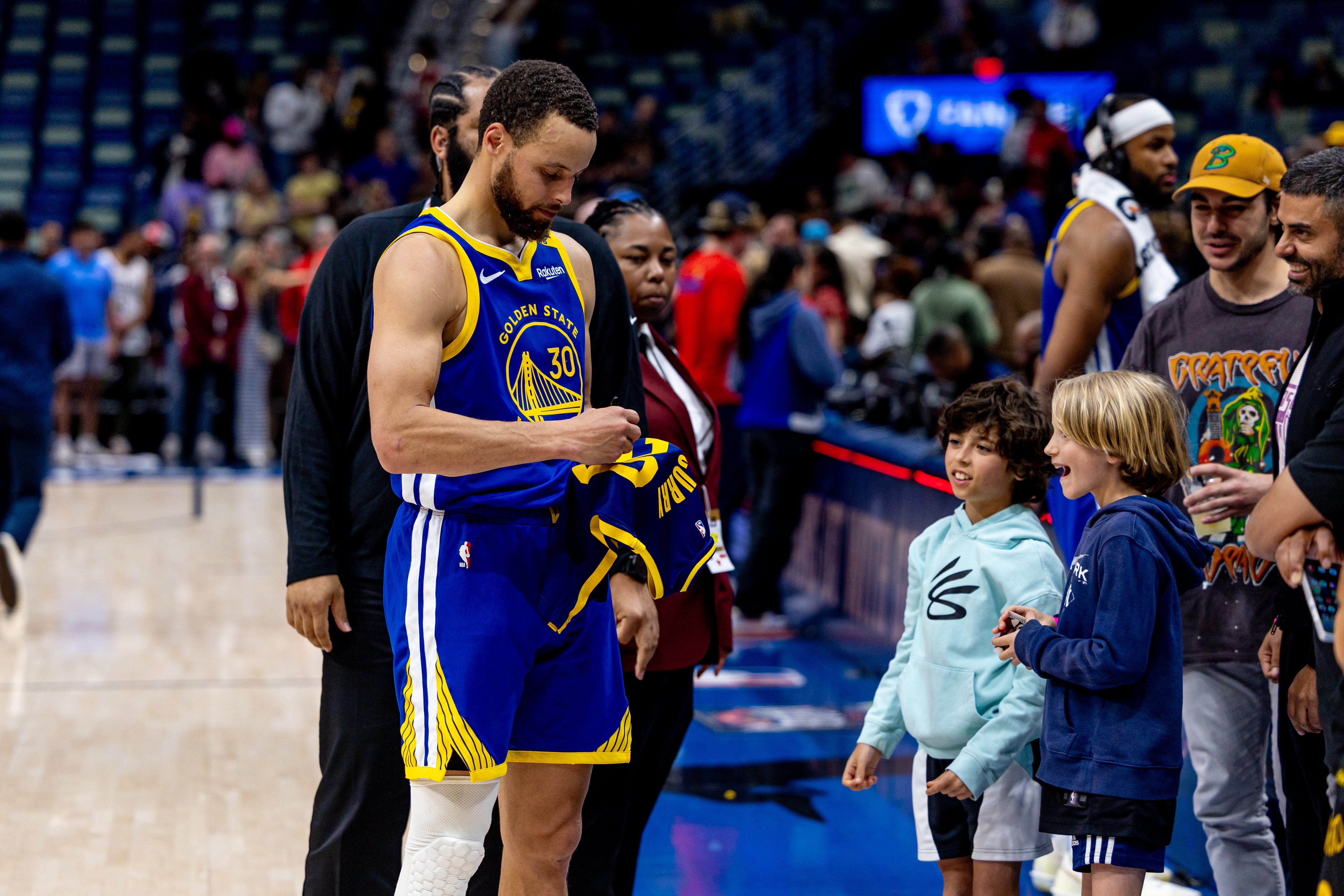小學(xué)生聚會??庫里賽后耐心給小球迷球衣簽名