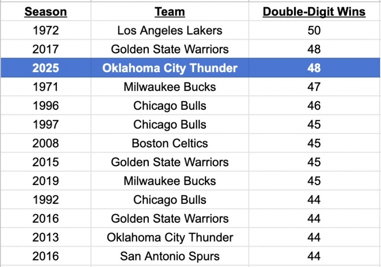 排在歷史第一的是1971-72賽季的湖人,那個(gè)賽季湖人50次贏對(duì)手兩位數(shù)。雷霆距離這個(gè)紀(jì)錄只差兩場(chǎng)(還剩8場(chǎng)常規(guī)賽)。