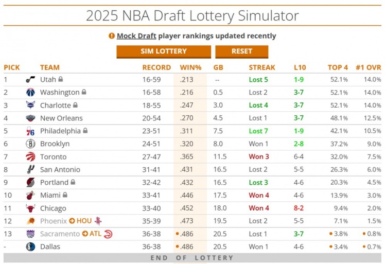 不過,如果從另一個方面看,76人無緣附加賽也不算壞事,目前他們的戰(zhàn)績聯盟第5差,將很有機會保住自己今年的首輪簽。如果以倒數第5的排名結束賽季,76人有42.1%的概率抽中前四,最差是第9。如果常規(guī)賽最后階段還能繼續(xù)降低自己的排名,他們還能增加保住自己今年首輪的概率。