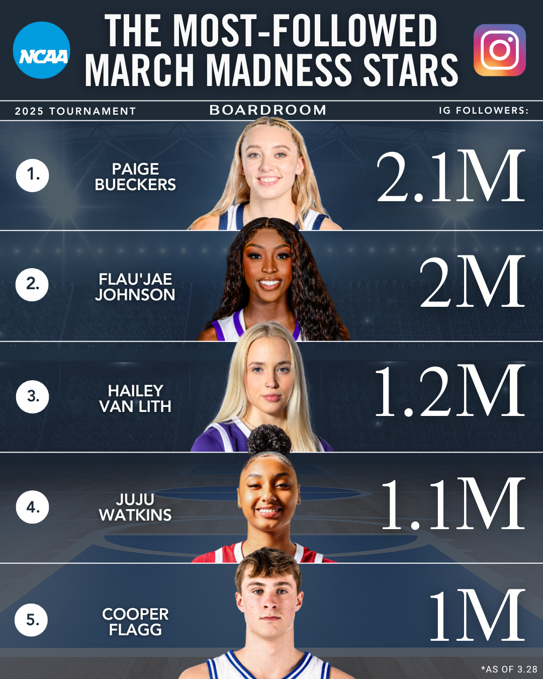 03月30日訊 美媒Boardroom今日統(tǒng)計了本屆NCAA瘋三球員的Instagram粉絲排名,NBA狀元大熱弗拉格以100萬粉絲排名第5,粉絲數(shù)“僅為”WNBA狀元大熱佩奇-布克斯的一半不到。