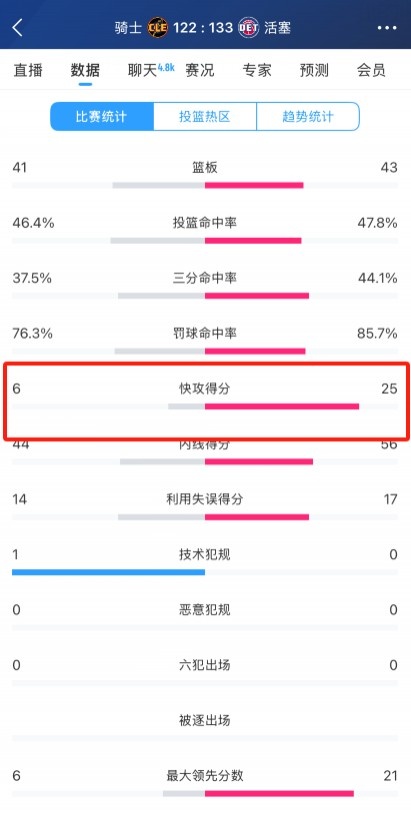 本場(chǎng)比賽,兩支球隊(duì)在快攻得分方面表現(xiàn)差異很大,活塞全場(chǎng)快攻得分為25分,而騎士?jī)H僅只有6分。