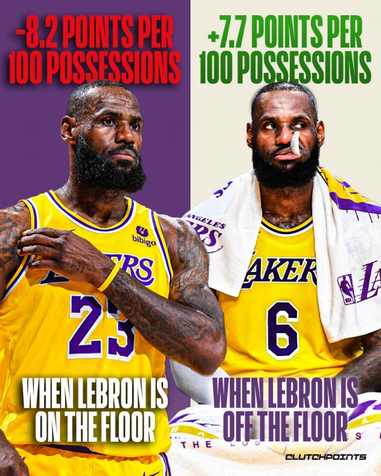本賽季詹姆斯在場時湖人百回合凈負8.2分下場后凈勝7.7分