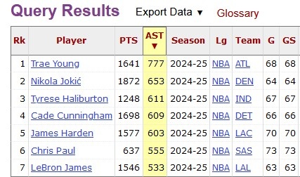 本場(chǎng)過后,特雷-楊本賽季助攻數(shù)逼近800,來(lái)到796。他也高居賽季助攻榜首位,比第2名約基奇多了143個(gè)!榜單前7名如下: