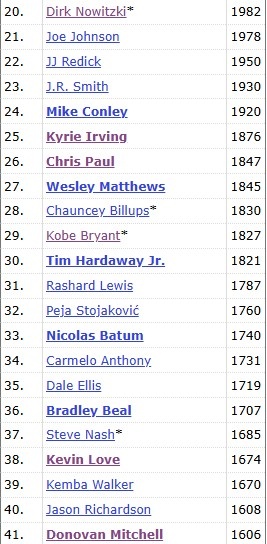 而在現(xiàn)役球員中,米切爾則排在第20,排在他前面的是樂(lè)福的1674記。