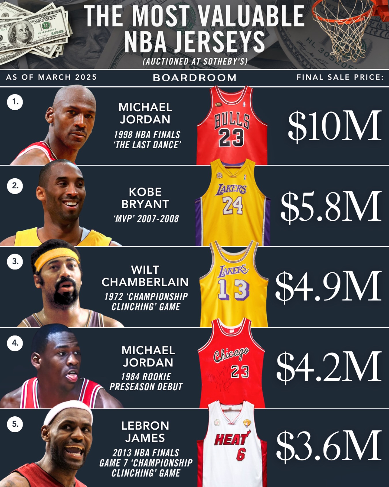 3月31日訊 近日,著名拍賣行蘇富比拍賣行更新了NBA歷史最貴單件球衣拍賣價。其中98喬丹的“最后一舞”以高達(dá)1000萬美元的價格斷檔領(lǐng)先,前五如下: